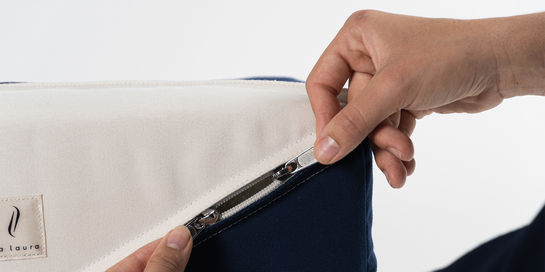 Kein einziges Feature der Tasche von La Laura ist zufällig. Die Tasche ist geradlinig, aber nicht langweilig. Einfach, aber nicht simpel. Praktisch, aber nicht überladen. Geräumig, aber nicht umständlich. Das Seitenverhältnis lässt sie kleiner wirken, die Geometrie dynamisch, die Farbkombination mit hellem Stoff leicht. Der Geistesblitz war aber der Reissverschluss, der diagonal über die Ecke verläuft und damit eine besonders grosse Öffnung schafft. Heute ein Design-patentiertes Feature, das die Tasche wirklich einzigartig macht. Nicht nur optisch.